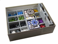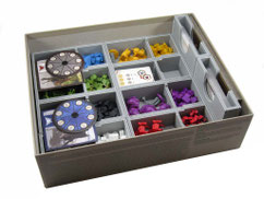 Here you can see the top layer of trays. The large player boards and dials are on the left. In the middle are the trays for the cards, coins, and resource tokens. There is sufficient storage space for the realistic resource tokens, the metal coins, and also for seven combat dials should you have them. Note: The FS-SCY insert can be used in the Legendary Box® in combination with our FS-SCY+ insert compatible with the Fenris® expansion box. You can see more info on this at the bottom of the FS-SCY+ product page. ![]() With the top layer removed you can see the player piece trays underneath, one for each player faction. On the right are two tall trays for vertical storage of the large tarot sized cards. ![]() With the two tall tarot card trays removed you can see the remaining player boards standing vertically against the side of the box. ![]() There are seven player trays, with separate slots for the miniatures and the player tokens. The eighth tray is for the combat cards and structure bonus tiles in one slot and the other tokens in the other slot. The combat cards can all be sleeved. ![]() The coin slots are split to have separate slots for each size of coin. The two resource trays separate each of the four resource types. ![]() The remaining top layer trays are for the medium sized cards, the encounter and multiplier tokens. There is space for all cards to be sleeved. ![]() The two tarot sized card trays have space to separate the encounter and factory cards. Again there is room for all the cards to be sleeved with quality sleeves. ![]() The two tarot sized card trays height is designed to reach the top of the box. This leaves a carefully measured space for the board and the rulebooks. ![]() All the trays can all be used in game to help organise components during the game, as well as speeding up setup and clear away times. The player trays allow for the additional combat dials to be stored. There is space on top of the player boards for three dials, and an additional four dials can now be stored underneath slotting into the tops of the player piece trays. ![]() If you have just the two combat dials that come with the original game, then you need to off set the player piece trays as shown here. This provides support for the trays that will go on top. ![]() Here you can see how the resource trays function with the realistic resource tokens. If you are a fan of Scythe®, why not check out our other inserts compatible with the range: FS-SCY+ for Scythe: The Rise of Fenris®