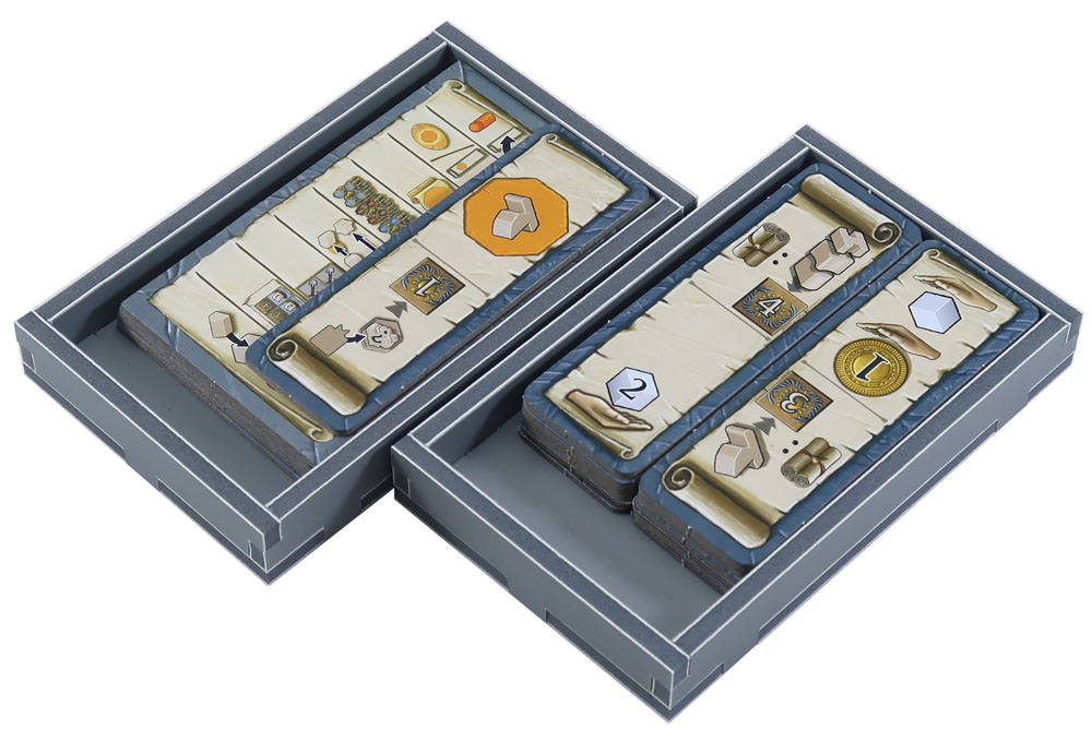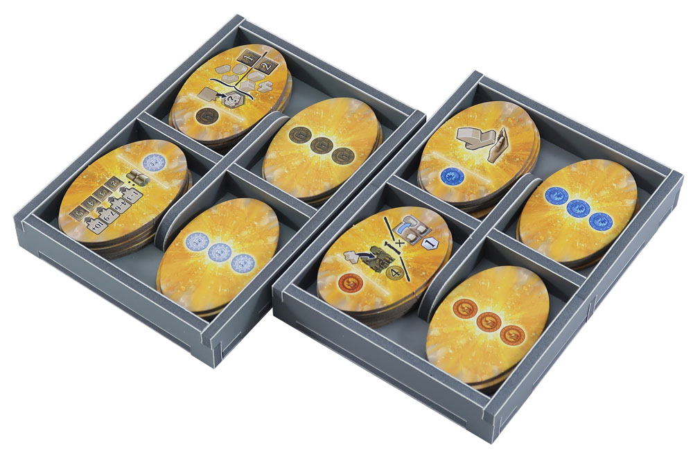 FS-TRM+ is designed to work together with our other Terra Mystica insert FS-TRM, being added to one of the expansion boxes together with the boards not contained in the main game box. These are the trays from the insert. There are two trays for the white and orange player pieces which also store the new scoring tiles. And seven trays for the other colours including slots for the trade markers. The last small tray is for the canals and dock markers. ![]()