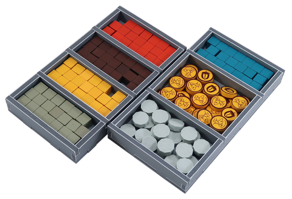 The trays are arranged in up to three layers. Note that the player boards, score pads and other tiles are stored together at the top right of the images. The wooden master builder hammer is placed at one of end of the larger card tray. ![]() ![]() The insert includes trays for all of the game components and cards. Each of the wooden building types has it's own slot, as do the resource cubes. All the card trays have space for sleeved cards. ![]() As mentioned above all of the trays can be used during the game to organise the components and make access by all players easy. When packing the box, the player boards, score pads, lodge boards, and chest boards are placed together in the top right corner of the box. Then simply place the rule books on top of everything. This fully fills the box and allows for vertical storage of the game.