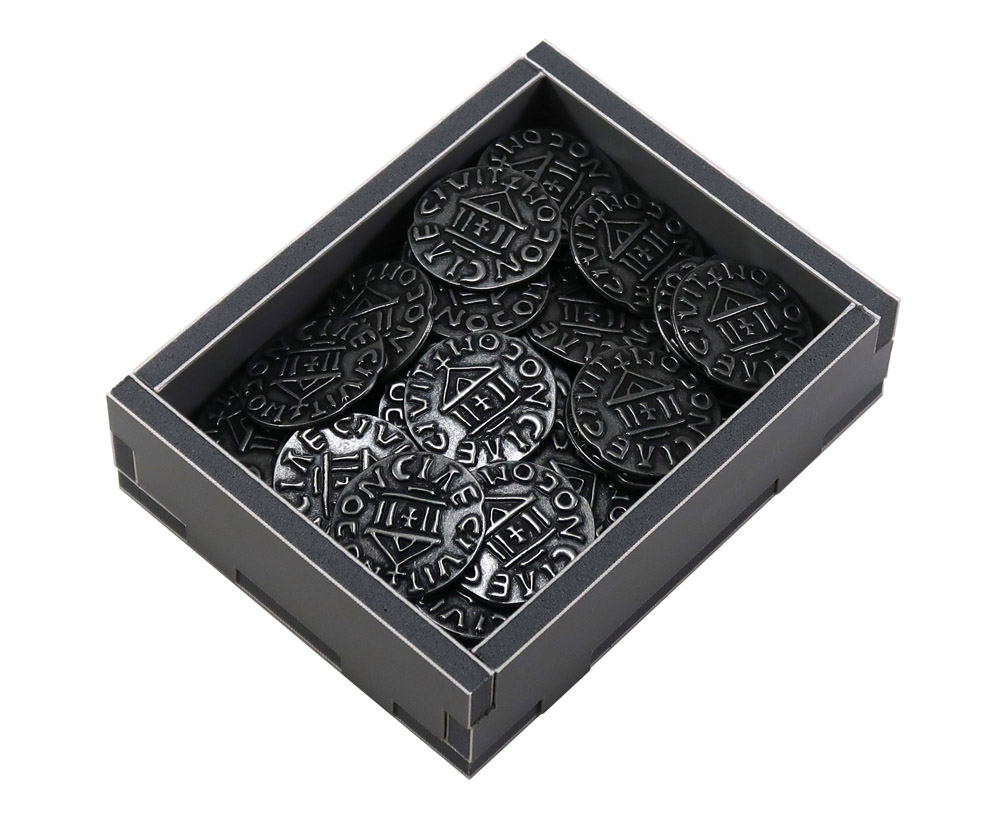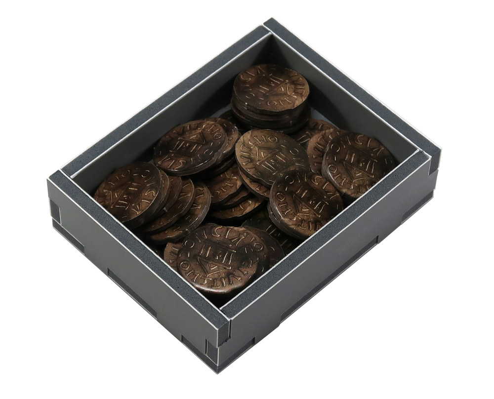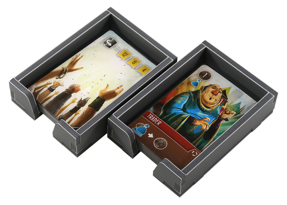 The trays are arranged in two layers as shown below. Note that the viscounts pieces are placed underneath the castle, and that the two layers of trays are separated by two of the player boards. ![]() ![]() The insert includes one large tray for storing both large and small cards. In addition there are two regular sized trays for large cards. There is space for all cards to be sleeved with quality sleeves. There is one tray for each of the player piece colours, and two trays for the resources and round markers. ![]() Note that the manuscript tiles do not have a tray, they are instead placed in-between the player piece trays resting on a sloped wall of the larger card tray. As these tiles are all placed directly on the board during setup they do not need a dedicated tray during game play. The coin tray works equally well with either the card coins from the game, or the upgraded metal coins. When packing the box, first place the remaining two player boards on top of the trays to cover them. Then place the rule book, followed by the main board segments. This fully fills the box and allows for vertical storage of the game. ![]() ![]() If you are a fan of Viscounts of the North Sea®, why not check out our other inserts compatible with the range: FS-RDRS for Raiders of the North Sea® FS-RDSCY for Raiders of Scythia®
